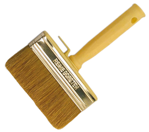 Ворс кисти изготовлен из натуральной светлой щетины, который прочно закреплен металлическим оцинкованным бандажом. ТОПС 50% Пластмассовый корпус оснащен отверстием для подвески и крюком для крепления на ведро. Может использоваться с удлиняющими стержнями для покраски труднодоступных мест и высоко расположенных поверхностей.