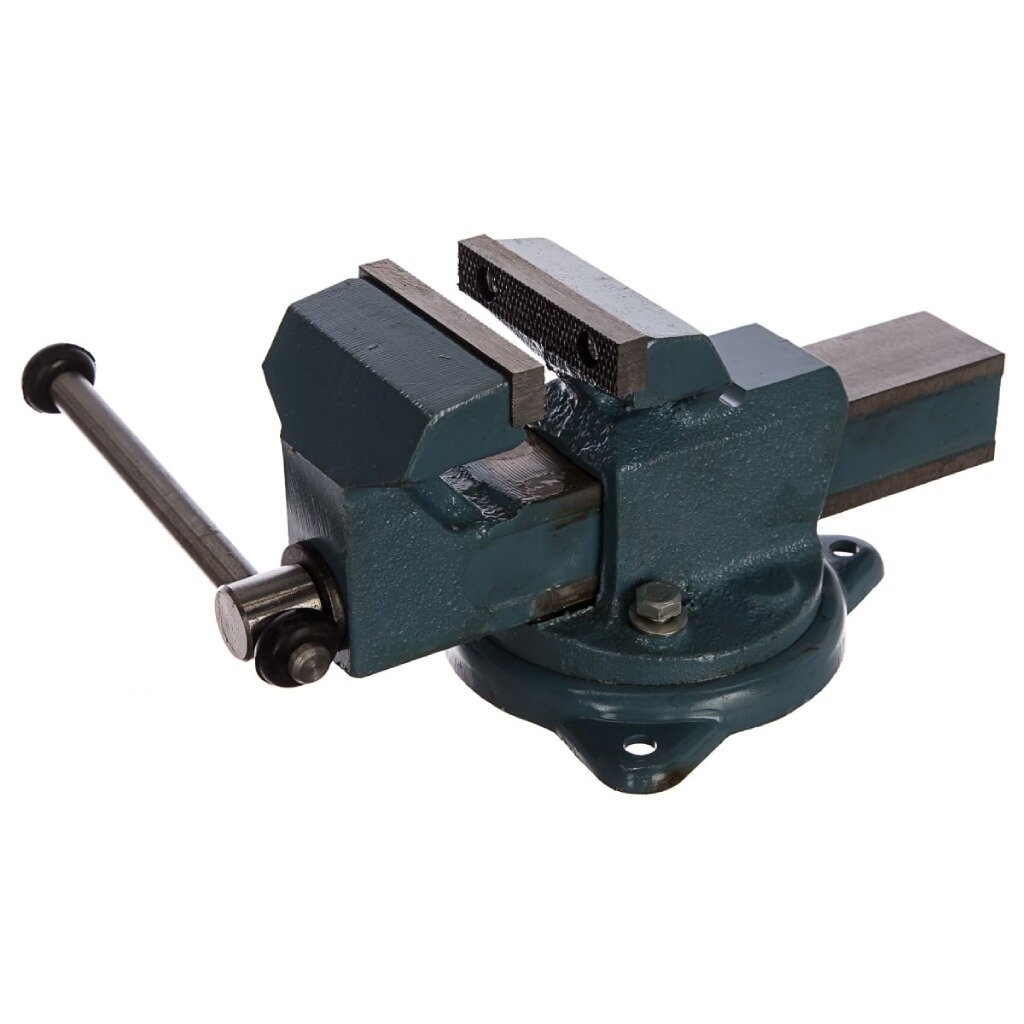 Фиксация осуществляется винтовым зажимом с рукоятью с пластиковым наконечником, которая имеет возможность перемещения относительно центра. Рифленая поверхность губок обеспечивает жесткую фиксацию заготовок любой формы. Тиски имеют возможность поворота относительно основания, это расширяет возможности обработки. Слесарные тиски - это полупрофессиональное зажимное приспособление, которое используется в различных мастерских и частных хозяйствах. Обслуживание тисков сводится в смазке направляющих и винтовой паре.