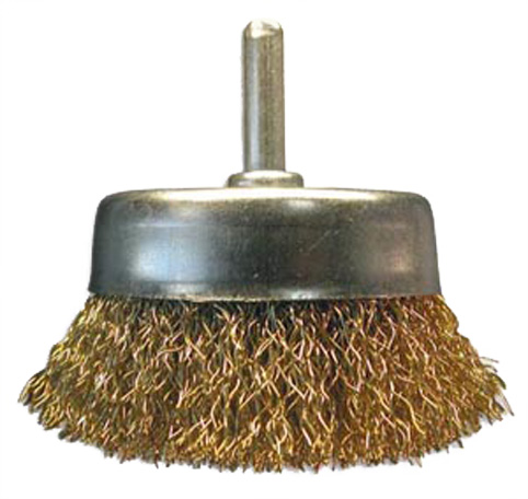 Корпус щетки (D-75 mm) выполнен из стали с оцинкованным покрытием. Щетина из крученой стальной омедненной проволоки диаметром 3,0 мм. Диаметр шпильки 6,0 мм устанавливается в патрон электродрели, поддерживающей скорость 4500 об/мин. Форма чашки позволяет обрабатывать плоские участки большой площади. Латунированное покрытие щетины и цинковое - корпуса обеспечивают защиту щетки от коррозии. Щетка применяется для щадящей очистки поверхностей от ржавчины, грязи, удаления лакокрасочных покрытий, получения заданной шероховатости