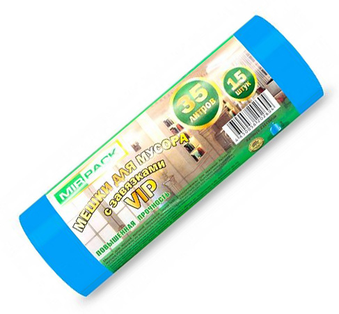 Мешок изготавливается из полиэтилена ниского давления. Мешки с завязками, рассчитанные на 35 л мусора, пользуются высоким спросом. Они находят применение в быту, офисах, торговых точках, образовательных учреждениях. Позволяют собирать разные отходы и поддерживать чистоту в помещениях.