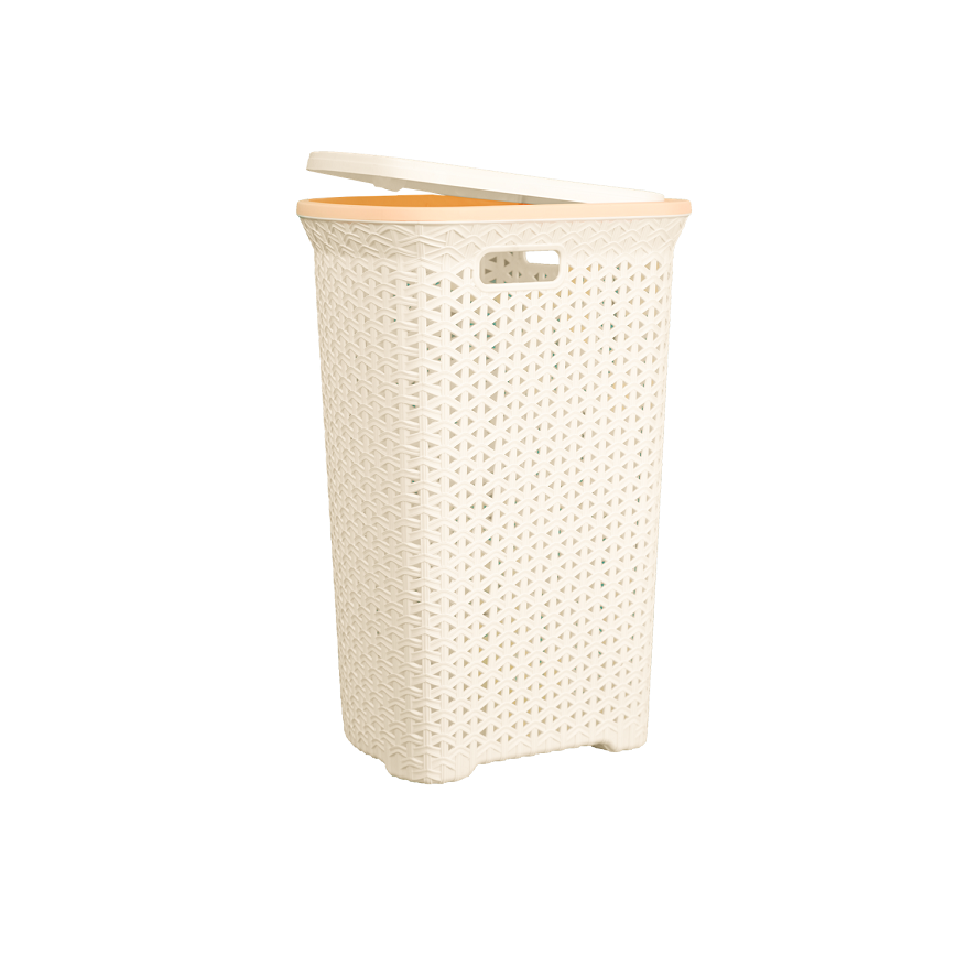 Угловая корзина для белья с крышкой с рисунком в виде плетения. Есть отверстия для рук, благодаря которым удобно брать корзину. Корзина плотно закрывается крышкой, которая поможет скрыть содержимое. Можно использовать как для грязного, так и для чистого белья.